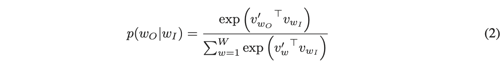 (2)번 식에 해당하는 기존의 softmax 방법은 입력단어 \(w_O\)의 output이 출력 단어 \(w_O\)일 확률을 최대화 하는 방향으로 모델을 학습합니다.