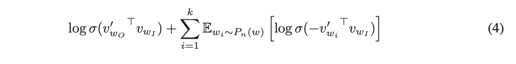 (4)번 식의 좌측 term은 입력 단어 \(w_I\)에 대하여 positive sample \(w_O\)이 output일 확률을 최대화 합니다.