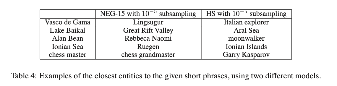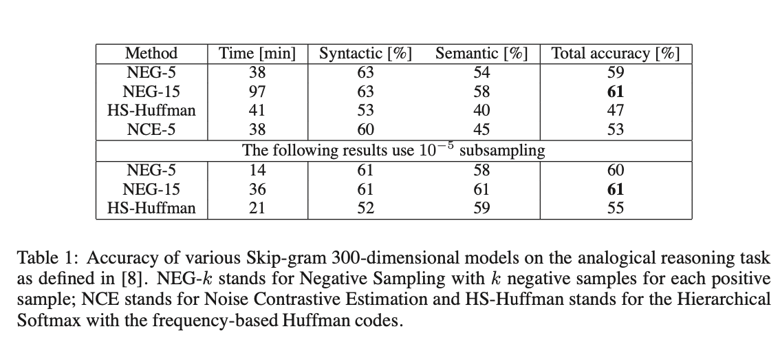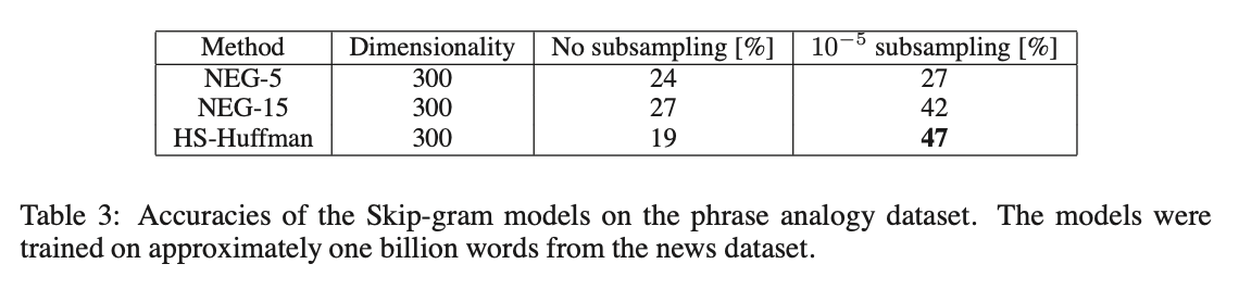 Hierarchical Softmax(HS), Noise Constrastive Estimation(NCE), Negative sampling(NEG), subsampling을 활용한 실험결과는 위와 같습니다. NEG의 성능이 HS의 성능을 크게 웃돌았습니다. 그리고 때로는 NCE보다도 좋은 성능을 보였습니다. subsampling 역시 성능 속도와 정확도 개선에 어느정도 기여했음을 확인할 수 있습니다.