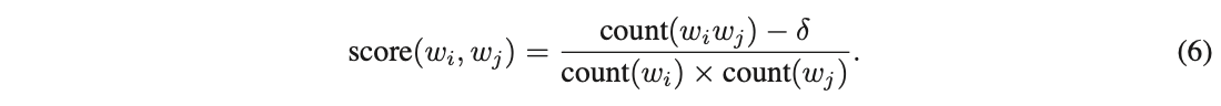 방법은 다음과 같습니다. 위의 식을 통하여 함께 자주 등장하면서 각각 등장하는 횟수 자체는 적은 단어들에 대해 bigram을 형성하고, 이를 unique한 token으로서 training data에 추가하였습니다. \(\delta\)는 threshold로서 적용됩니다.