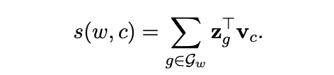 따라서 이제는 context word와의 score function을 subset \(\mathcal{G_w}\) 의 모든 성분\(\{1,...,G\}\)와 context word 간의 내적들의 합으로 구하게 됩니다.