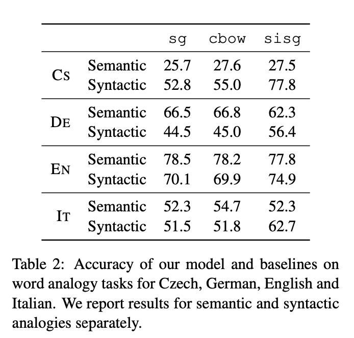 더하여 analogy task에서도 상대적으로 문법적으로 복잡도가 높은 Cs, DE가 좀 더 큰폭의 성능개선을 보였다는 것을 확인할 수 있습니다.