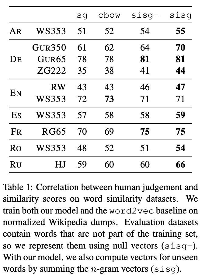 보시는 것과 같이, EN dataset(english) 한가지를 제외하고는 제안한 sisg 방법이 다른 방법보다 좋은 성능을 보였습니다.