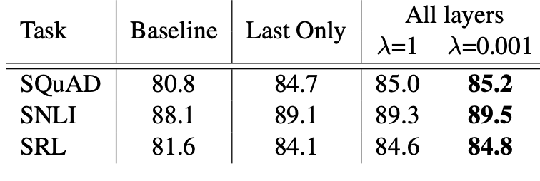 모든 biLM layer를 사용하여 ELMo를 표현하고 적절한 \(lambda\)를 적용하였을 때 가장 좋은 성능을 보였습니다.