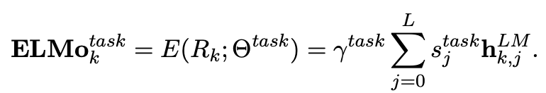 token \(k\)에 대한 ELMo representation은 아래와 같이 task에 따른 layer j의 softmax 가중치 \(s_j^{task}\)를 이용해 \(h_{k,j}^{LM}\)를 선형결합하여 single Vector로 표현됩니다.