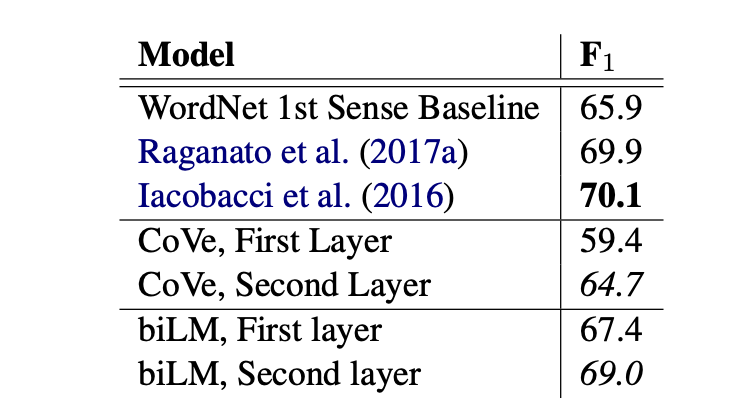 WSD의 경우, First layer를 이용한 것 보다 Second layer를 이용한 성능이 좋았기 때문에 higer-layer가 context 파악에 있어 더 중요한 정보를 제공 한다는 것을 확인할 수 있었습니다.