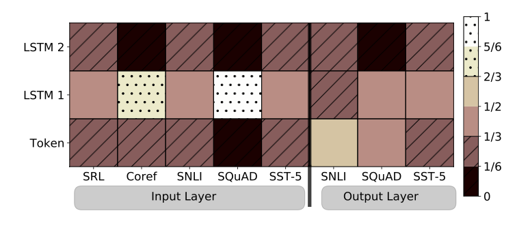 task의 Input Layer와 Output Layer가 더 높은 가중치를 두는 biLM layer를 확인하기 위한 시각화 결과입니다.