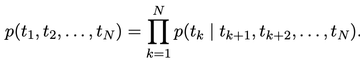 반대로 backward LM은 Token Sequence의 확률을 계산할 때, token \(t_k\)의 확률을 k 시점 이후의 token들 \((t_{k+1},...,t_N)\)을 활용하여 모델링합니다.
