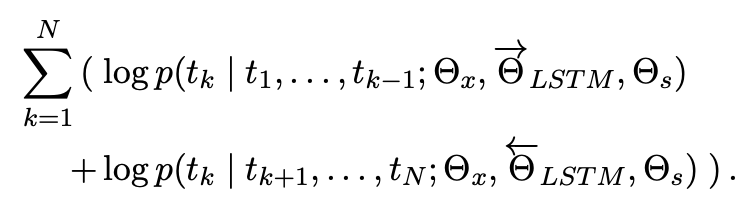 forward, backward LSTM이 token embedding \(\theta_x\)와 softmax layer \(\theta_s\)를 공유하기 때문에 위와 같은 log-likelihood로 표현할 수 있습니다.