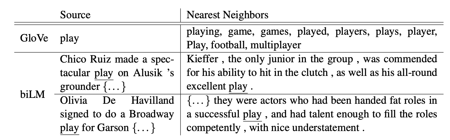 반면에 biLM의 play는 각각 다른 문맥에서 주어진 play와 의미가 일치하는 play를 각각 유사한 단어로 추천한 결과를 확인할 수 있습니다.