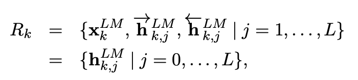 \(j\) 번째 LM layer \((j = 1,...,L)\)의 context-dependent word representation인 \(\overrightarrow{h_{k,j}^{LM}}\), \(\overleftarrow{h_{k,j}^{LM}}\)를 학습할 수 있습니다.