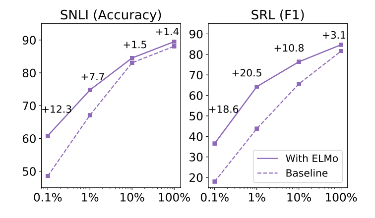 학습데이터가 작을수록 ELMo를 사용하면 더 효율적인 학습이 가능함을 확인할 수 있습니다.