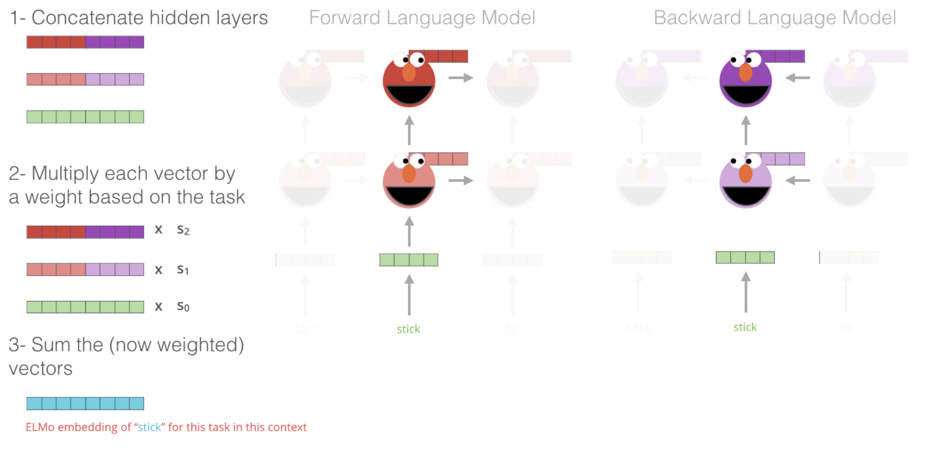 ELMo는 이런 biLSTM Layer들의 representation \(h_{k,j}^{LM}\)을 linear combination(선형결합)하는 방법으로 각각의 단어를 표현합니다.