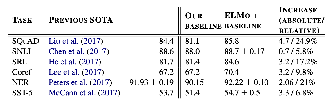ELMo는 또한 Attention을 활용한 모델이 아님에도 Bert와 같은 해에 발표되어 다양한 task에서 매우 우수한 성능을 보였습니다.