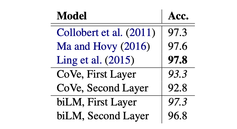 이러한 과정을 통해 보다 양질의 ELMo representation을 얻어 down stream task의 성능을 향상시킬 수 있습니다.