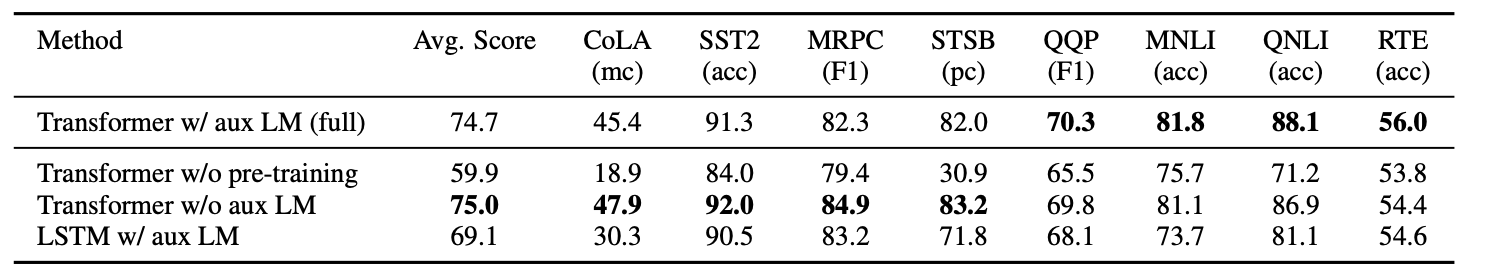 역시 대부분의 실험에서 GPT가 우수한 성능을 보였는데, Attention을 더한 ELMo model에 비해서도 특히 좋은 성능을 보였다는 점이 주목할만 합니다.