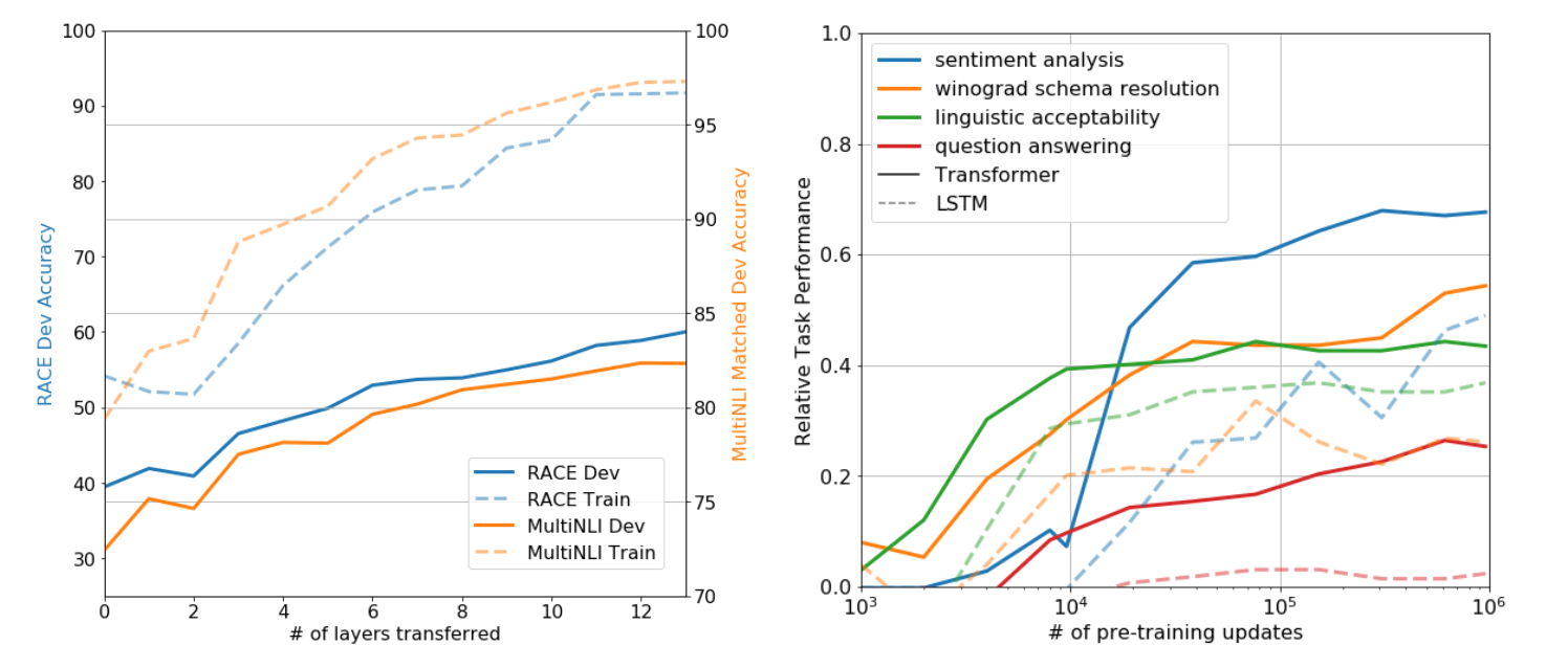 오른쪽 그래프는 Transformer 유무와 pre-training에 따른 각각 task의 Zero-shot 성능 비교입니다. 실선은 Transformer를 사용한 모델이며, 점선은 LSTM을 사용한 모델입니다.