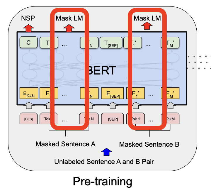 이 과정에서는 첫번째 토큰인 [CLS] 토큰을 활용하여 output layer에서 [IsNext], [NotNext]를 예측하도록 학습합니다.