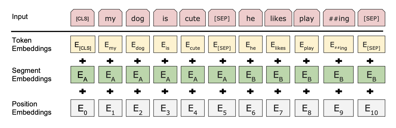 따라서 추가적으로 각각의 문장을 구분해 주기 위한 Segment embedding을 더해 줍니다.