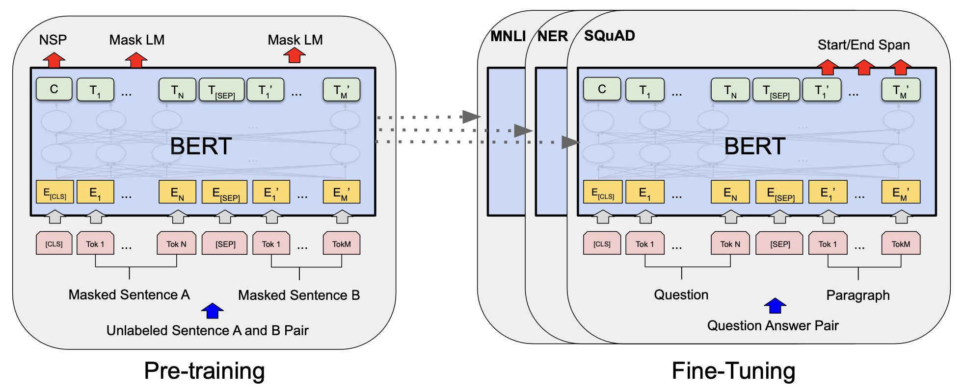 따라서 BERT는 MLM에 더하여, pre-training 단계에서부터 문장사이의 관계를 포착하도록 하는 next sentence prediction(NSP)를 진행합니다.
