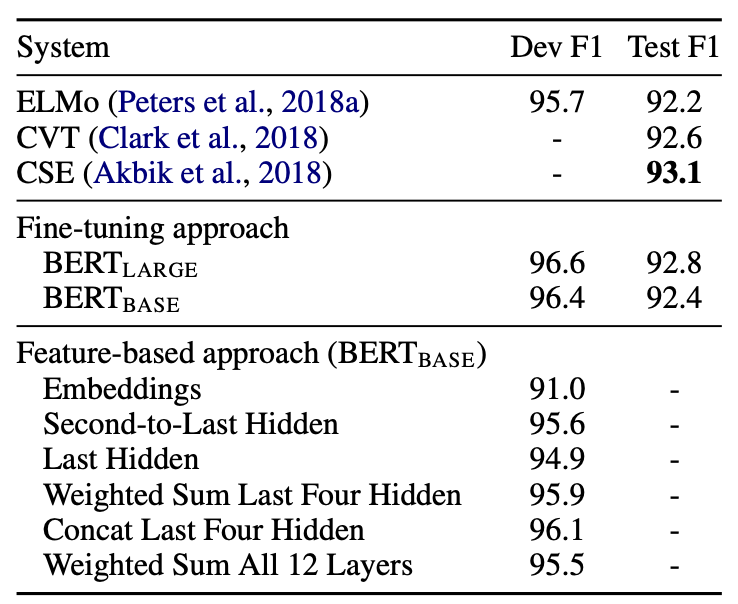 Feature based approach로 실험을 진행한 결과, 전체 layer를 가중합 하는 것 보다 마지막 4개 layer를 concatenate하는 방법이 가장 성능이 좋았습니다. 또한 fine-tuning의 성능과도 거의 차이가 없었다는 점이 주목할 만한 부분입니다.
