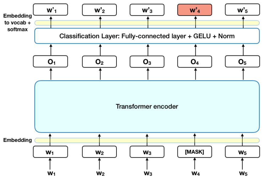 Masked languaged model은 전체 문장을 reconstruction 하며 학습하지 않고, 일정 비율(본 논문은 15%)로 Masking된 임의의 단어 토큰만을 예측하며 학습합니다.