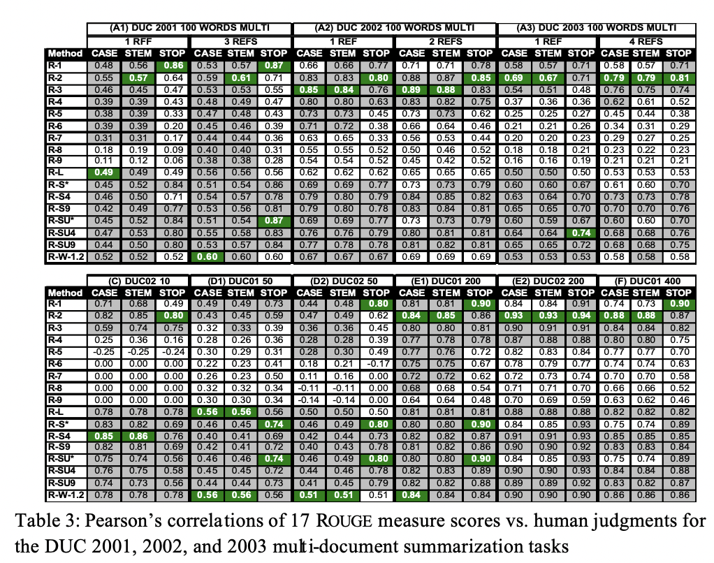 각각의 표에서 ROUGE score가 대체로 인간의 판단과 양의 상관관계를 보임을 확인할 수 있습니다.