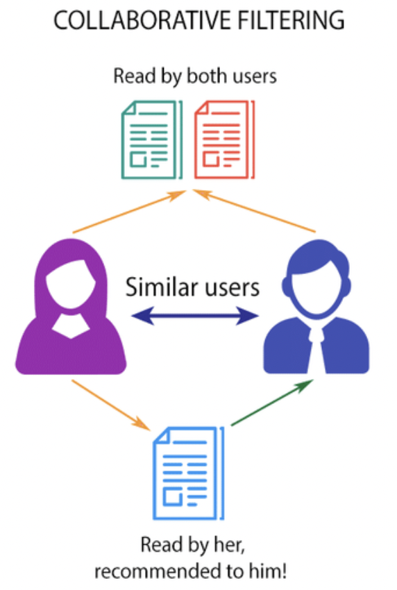 예를들어 설명하면 협업필터링은 "유저 A와 B가 아이템 1에 대하여 비슷한 평가를 내렸다면, 유저 A가 선호하는 다른 아이템인 2에 대해서도 B가 어느정도 같은 선호도를 가지고 있지 않을까?" 라는 생각과 같습니다