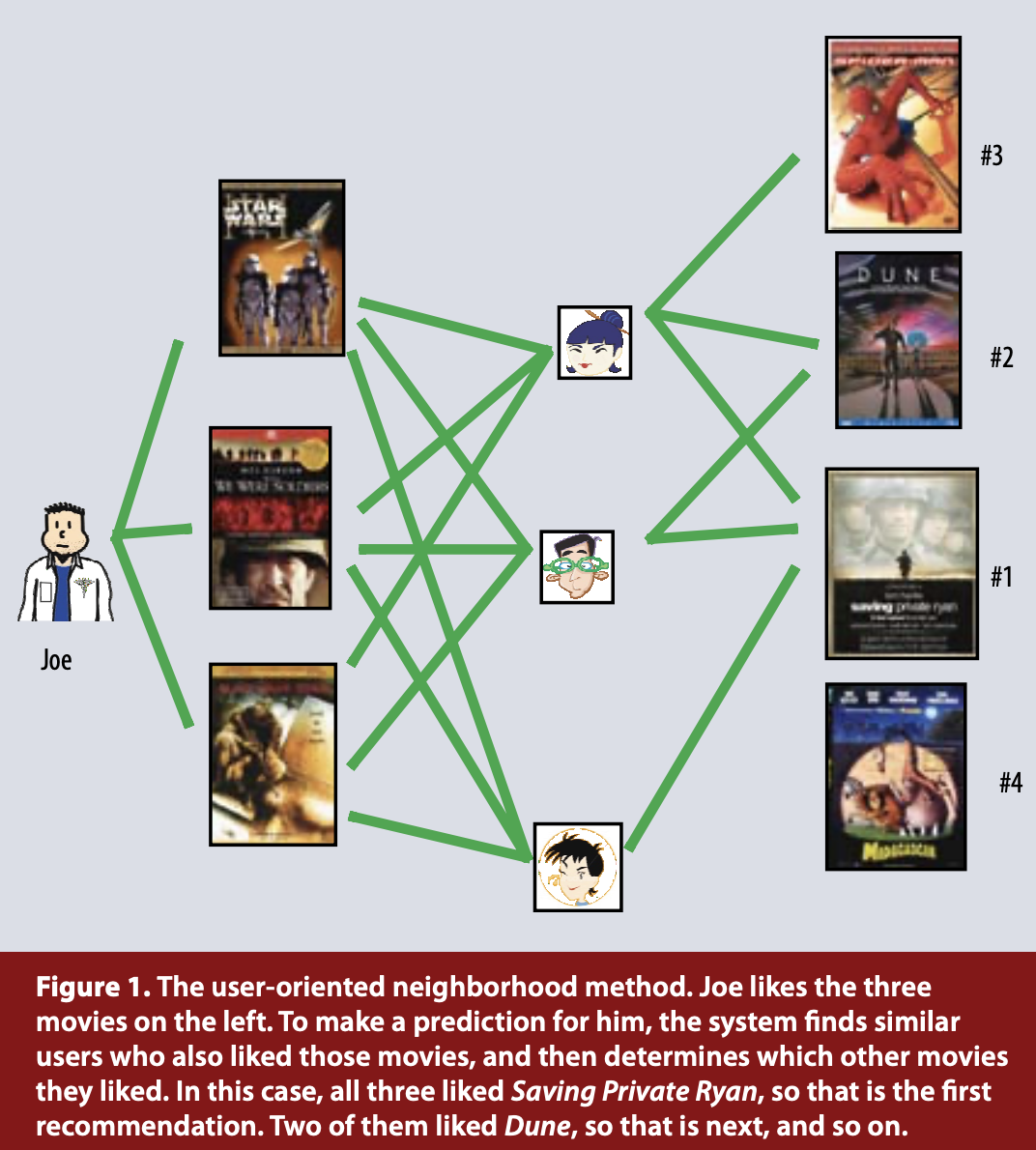 아래의 그림 예시는 Joe가 좋아하는 세편의 영화를 똑같이 좋아하는 이웃들의 또다른 선호 영화를 바탕으로 Joe에게 새로운 영화를 추천해주는 user-oriented neighborhood method의 예시입니다.