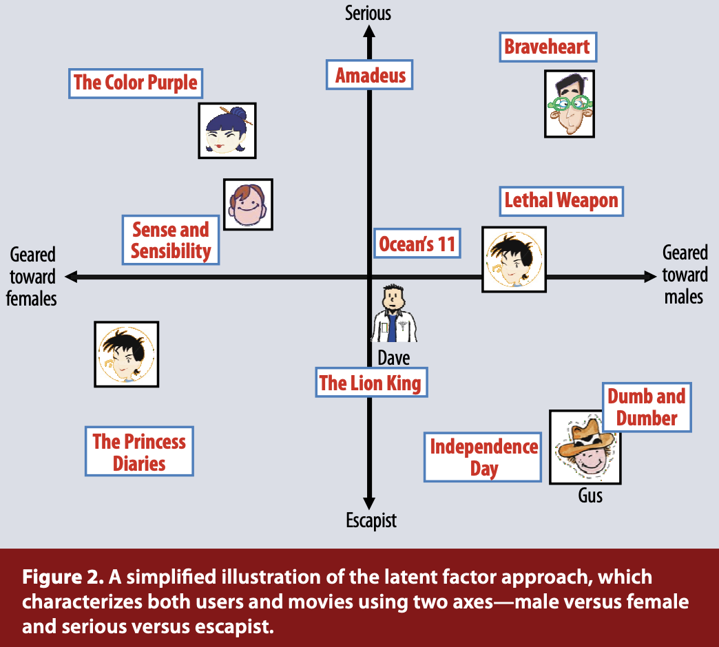 협업필터링에서 사용되는 또다른 방법인 Latent factor model은 user의 item 평가 패턴에서 추출된 20~100개에 해당하는 Latent factor(차원, 축)를 이용하여 유저와 아이템을 함께 특성화 하는 방법입니다.