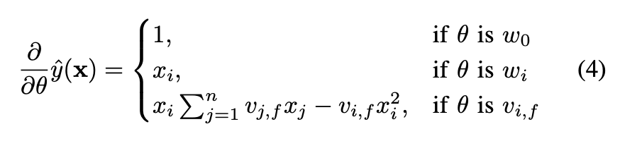 따라서 SGD를 사용하는 최적화 과정에서 FM의 파라미터 \(w_0,w_i,v_{i,f}\)는 효율적으로 학습이 가능합니다.