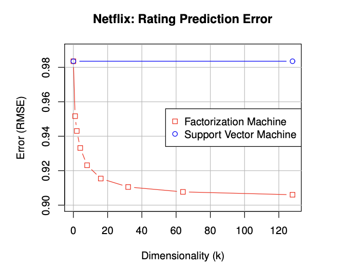 그 결과 SVM은 Sparse한 환경에서 학습에 실패하였으며, FM은 차원 증가에 따른 학습이 잘 진행되었음을 확인할 수 있습니다.
