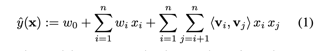 $$y_{FM} = <w,x> + \sum_{j_{1}=1}^{d}\sum_{j_{2}=j_{1}+1}^{d}<v_{j_{1}}, v_{j_{2}}> x_{j_{1}}x_{j_{2}}$$