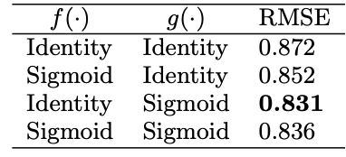 hidden layer에 비 선형성을 추가시켜주는 sigmoid \(g(\cdot)\)의 사용이 AutoRec의 성능에 큰 영향을 준다는 사실을 알 수 있습니다.