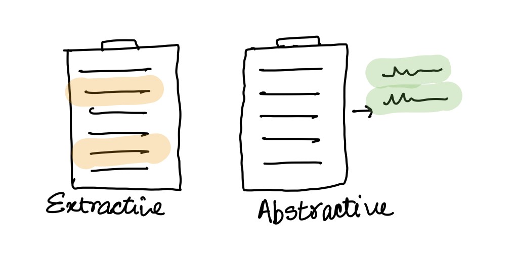 Text Summarization는 모델을 거쳐 생성된 output(summary)의 형태에 따라 Abstractive summarization(생성 요약)과 Extractive summarization(추출 요약)으로 구분됩니다.