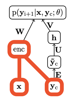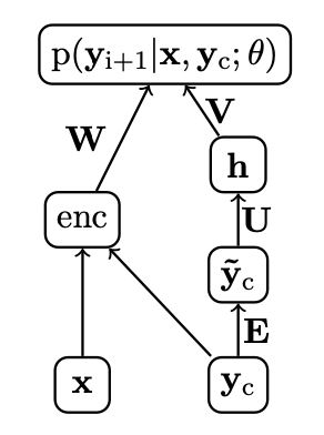 $$p(\mathbf{y_{i+1}}|\mathbf{y_c},\mathbf{x};\theta) \propto exp(\mathbf{V}\mathbf{h} + \mathbf{W}enc(\mathbf{x},\mathbf{y_c})),$$