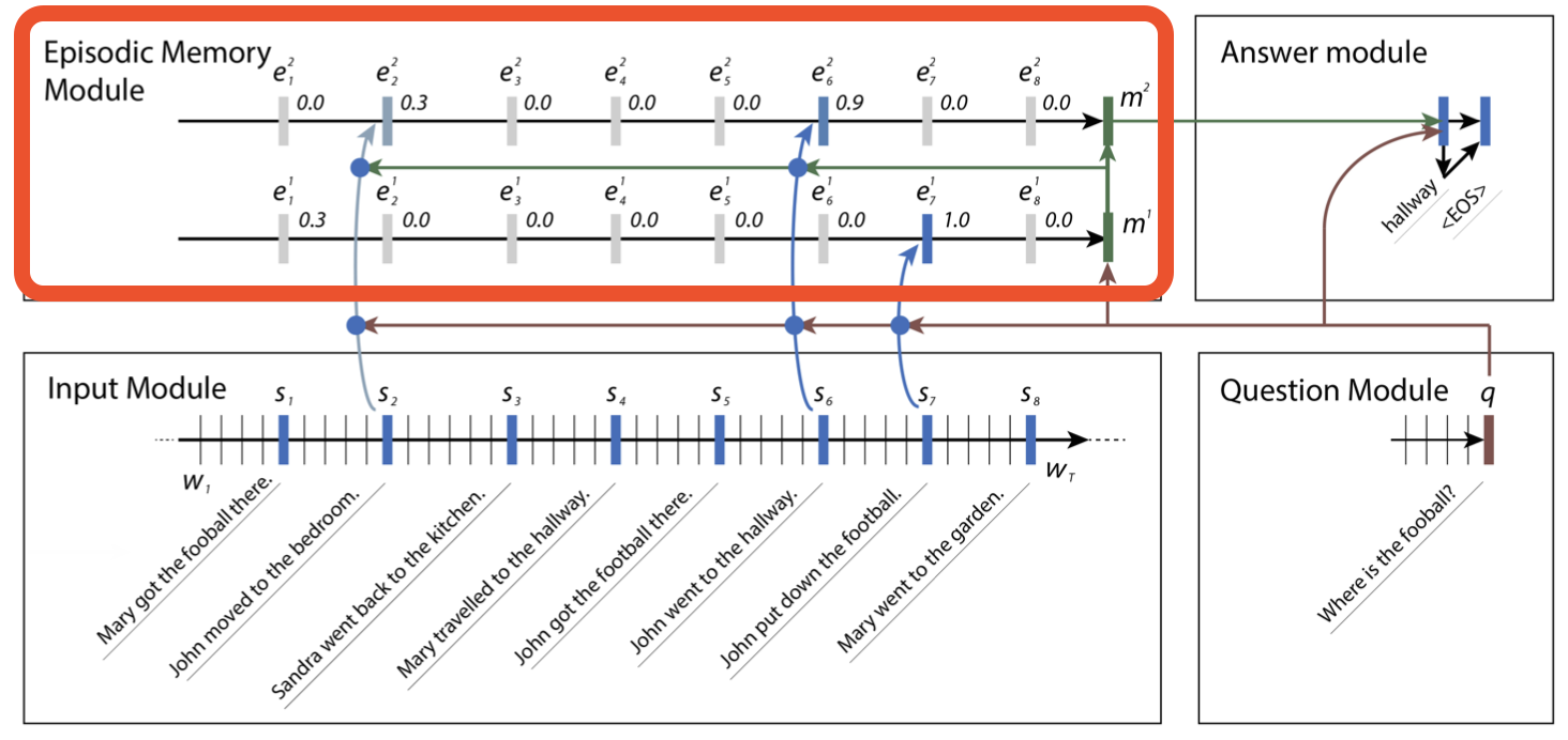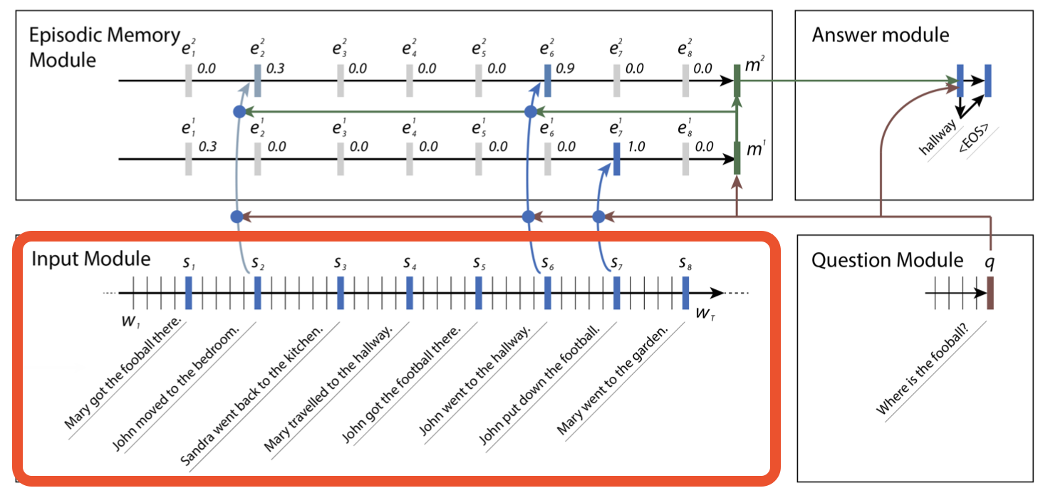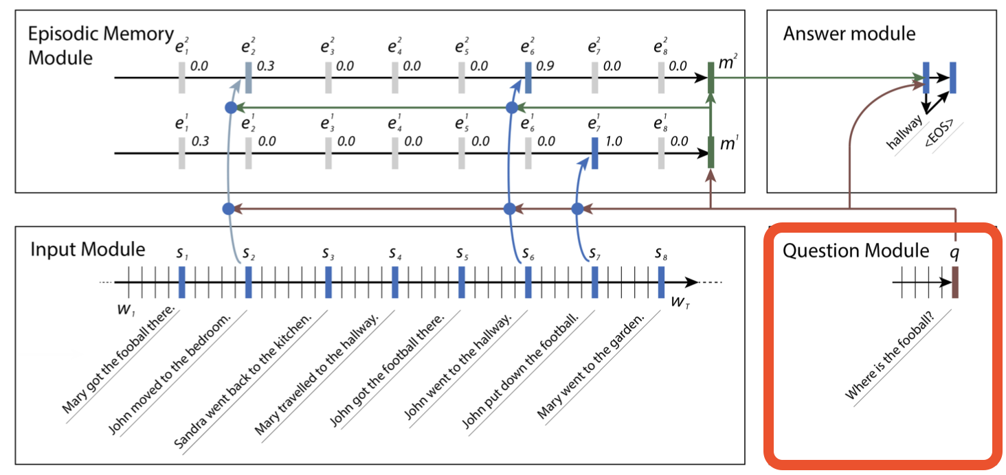 DMN은 위와 같이 네가지 모듈의 역할을 통하여 Question answering task를 수행할 수 있습니다.
