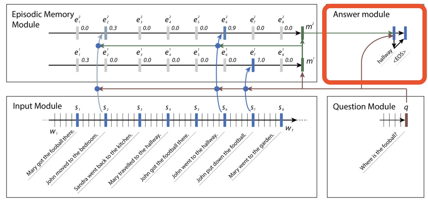 최종적으로 새로운 Episodic memory \(m^i\)는 Answer module로 전달됩니다.