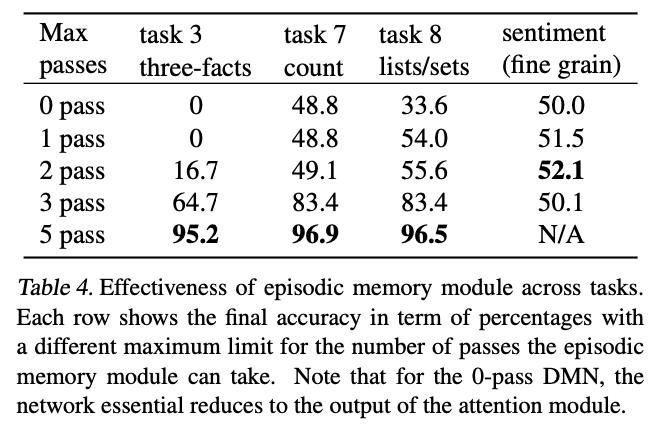 네번째 실험은 모델에서 가장 중요한 부분인 Episodic Memory Module에 대한 정량적 유효성 검증입니다.