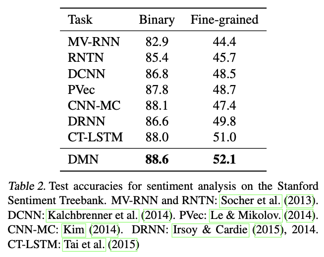 Positive/Negatve의 이진분류를 하는 경우와, very negative/ negative/ neutral/ positive/ very positive 총 5개의 label을 갖는 다중분류의 경우 모두에서 제안하는 모델인 DMN이 가장 우수한 성능을 보였습니다.